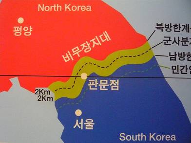 1953 wurde ein Waffenstillstandsabkommen geschlossen welches die Bildung einer 2 x 2km breiten entmilitarisierten Zone entlang der Demarkationslinie regelte. Diese schwerst befestigte Grenze der Welt existiert bis heute und in ihren Stellungen sind ständig bis zu 2 Millionen Soldaten stationiert.