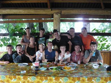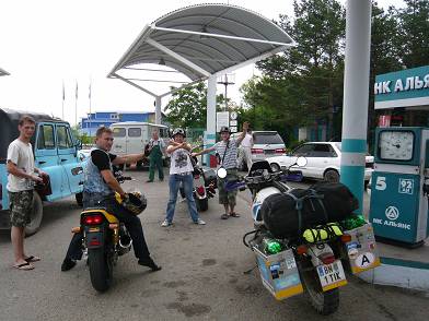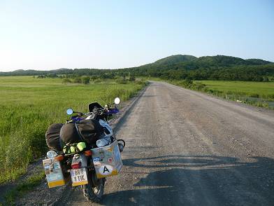 Als ich am Straßenrand anhalte um eine Trinkpause zu machen kommt mit plötzlich ein Auto entgegen. Der Fahrer dreht im Handbremsendrift mitten auf der Strasse um, lehnt sich weit aus dem Fenster und ruft mir irgendetwas auf Russisch zu. Im ersten Moment denke ich an einen Überfall aber dann versteh ich langsam was er will. Er sagt: “American Biker good, Ruski biker good“, und er ist ein Ruski Biker und lädt mich heute zu sich nach Hause zu seinem Bikerclub ein. Auch wenn ich natürlich kein American Biker bin freu ich mich sehr über die Einladung und gegen Nachmittag erreichen wir die kleine Stadt Lesozavodsk am Ussuri, dem Grenzfluss zu China.
