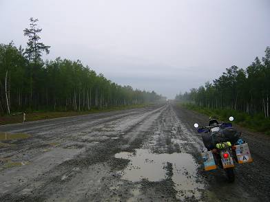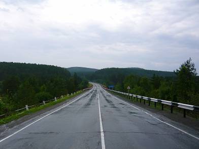 Genauso wie in Venezuela ist auch im Ural bei Regen höchste Vorsicht geboten, die Straße ist nämlich spiegelglatt. Der Grund dafür sind die schrottreifen Lastwagen, die sich mit kaputten Dichtungen in Schrittgeschwindigkeit über die Steigungen quälen und dabei die Strasse permanent mit einem feinem Ölfilm überziehen.