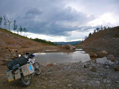 In „the long way round“ haben Charly und Ewan dieses Stück mit dem Zug überbrückt da eine Überlanddurchquerung unmöglich schien, seitdem sind aber wieder einige Jahre vergangen und es gibt zumindest laut Auskunft der Lastwagenfahrer eine Verbindung mit intakten Brücken. Über die Qualität der Strasse kann aber niemand wirklich Auskunft geben und die Aussagen reichen von „bad road“ bis „no road“. Na ja, wir werden sehen, die einzige Möglichkeit den Zustand einer Strasse wirklich in Erfahrung zu bringen besteht darin sie zu fahren. Mit Nahrung für 3 Tage und Benzin für 500 Kilometer mache ich mich auf den Weg.