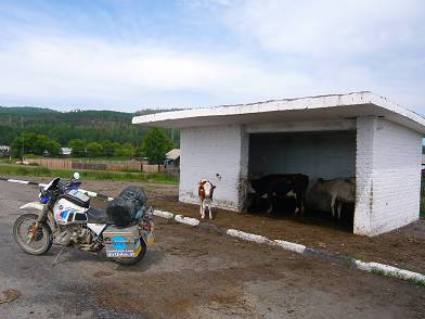 Effektive Wetterschutzmaßnahmen sind im rauen Klima Sibiriens von höchster Wichtigkeit und Bushaltestellen bieten einen hervorragenden Windschutz. Das haben auch die Kühe bereits begriffen. Mein Versuch eine kurze Pause einzulegen und etwas Tee zu kochen scheitert aus Platzmangel.