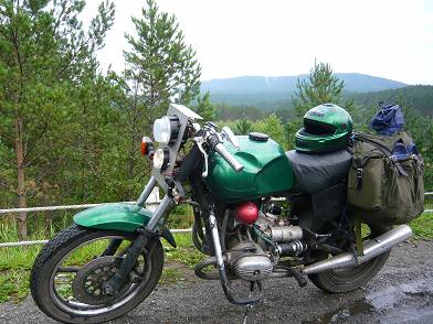 Russische Biker dagegen sind bekanntlich an winterliche Verhältnisse gewöhnt und sie schreckt ein Fahrverhalten wie auf Eis in keiner Weise ab. Mitten im perfekten Sauwetter habe ich die Ehre einen der lokalen Kurvenräuber auf seiner Hausstrecke begrüßen zu dürfen. Juri ist gerade auf dem Weg nach Moskau zu einem Bikertreffen und überquert den Ural traditionell auf einer Uralboxer. Das Motorrad hat er selbst aufgebaut und eine gewisse optische Eigenwilligkeit kann man dem Fahrzeug in der Tat nicht absprechen. Technisch scheint er die Maschine auch gut abgestimmt zu haben und die fast 3000 Kilometer von Omsk nach Moskau fährt er damit in 3 Tagen! Auf Russischen Strassen kein leichtes Unterfangen!