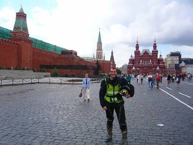 Gegen Nachmittag erreiche ich Moskau und steuere gleich ins Zentrum. Alles kommt mir noch genauso vor wie vor 17 Jahren. Als kleiner Bub schritt ich damals den roten Platz genau ab und fertigte eine Karte mit den ungefähren Distanzen zwischen der Kathedrale, dem Kreml und dem Leninmausoleum an. Wie ich heute das Motorrad über die Brücke fahre und vor mir die Basilika erkenne erinnere ich mich auf einmal wieder genau und fahre auf die Kirche zu. Neben mir verläuft die Kremlmauer und vor mir erkenne ich bereist die letzte Ruhestätte Lenins. Als ich anhalte sammeln sich sofort Passanten um mich und fragen mich wo ich herkomme. Als ich ihnen von meiner Reise erzähle und mir eine recht angeheiterte Hochzeitsgesellschaft schon Wodka anbieten will nähert sich die Polizei. Die Beamten sehen meine Landung am Roten Platz zunächst etwas weniger entspannt und ermahnen mich die Fußgängerzone sofort wieder zu verlassen. Die Menschen mit denen ich mich gerade angefreundet habe setzen sich sofort für mich ein und als die Polizisten hören, dass ich um die ganze Welt gefahren bin und dabei den weiten Weg von Vladivostok nach Moskau mit dem Motorrad zurückgelegt habe ist ein Erinnerungsfotos kein Problem mehr. Später wünschen sie mir sogar eine gute Weiterreise!
