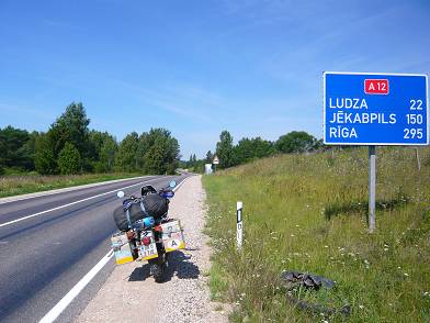 Die Formalitäten des Grenzübertritts erweisen sich auf beiden Seiten als absolut problemlos. Nach weniger als einer halben Stunde habe ich Russland verlassen und mit der Einreise nach Lettland bin ich wieder in der Europäischen Union. Mein letzter offizieller Amtweg führt mich schließlich zum Zoll um auf meinem Carnet de Passage die Wiedereinfuhr des Motorrades in die EU zu bestätigen. Die Beamten schauen etwas ungläubig als ich ihnen erzähle, dass ich schon seit fast zwei Jahren unterwegs bin. Ich bekomme aber sofort meinen Stempel und damit habe ich freie Fahrt, sowie noch rund 1500 Kilometer vor mir bis Wien.
