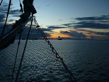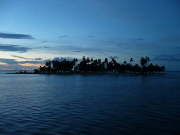 ruhig und in der Dämmerung erscheinen die San Blas Inseln am Horizont. Wir