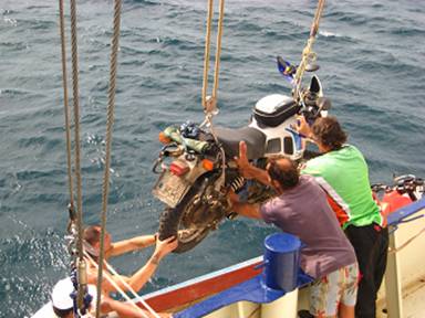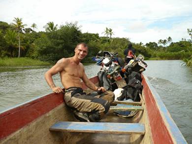 seiner tollen Crew und verladen die Motorräder in ein kleines Fischerboot.