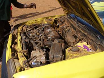 his car as he tries to find fuel. Within a few minutes the children of the neighborhood have gathered to watch the stupid Toubab (white man), who parks a taxi in the middle of the