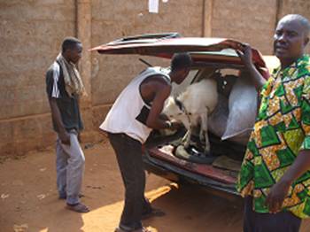 On my truck travel the men lashed the goats to the motorcycle.